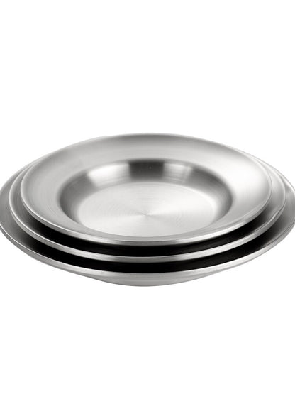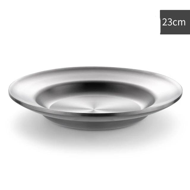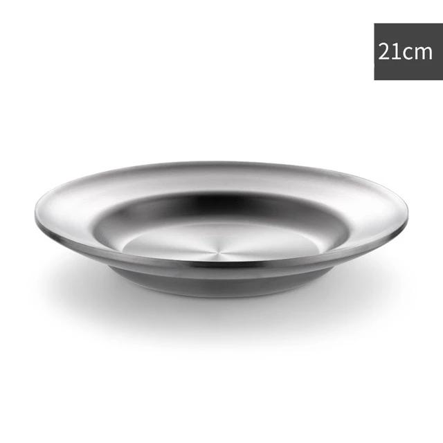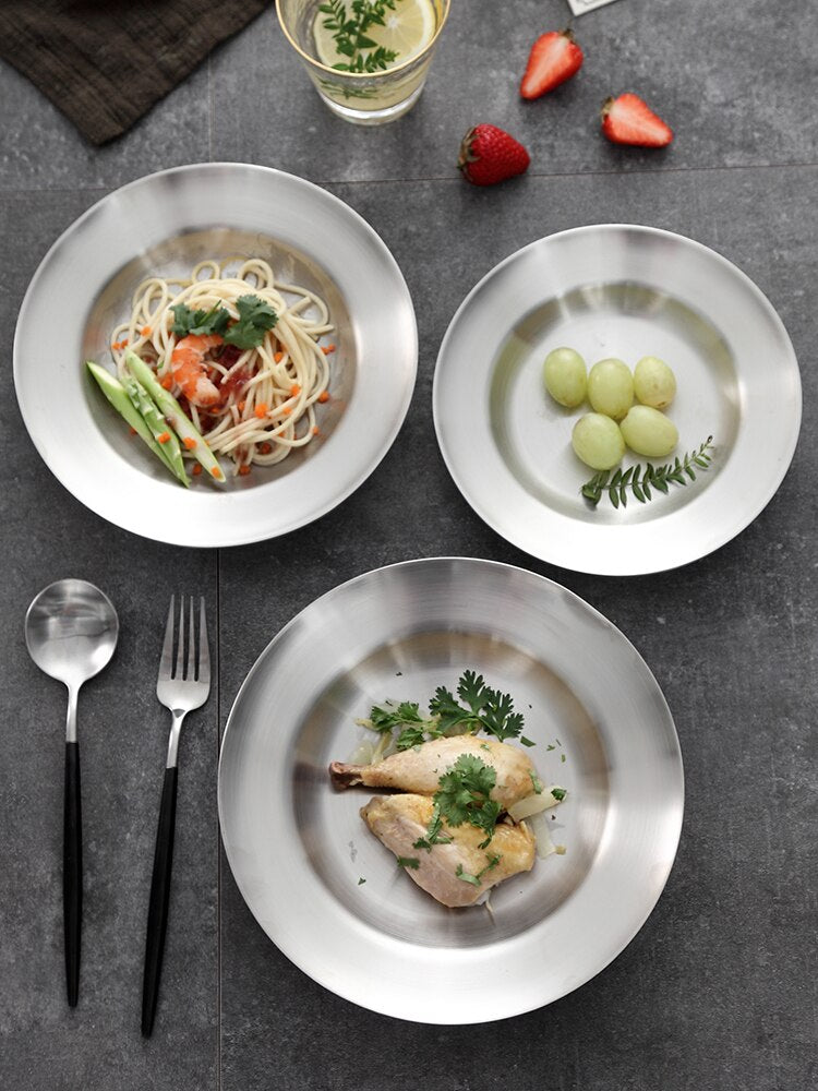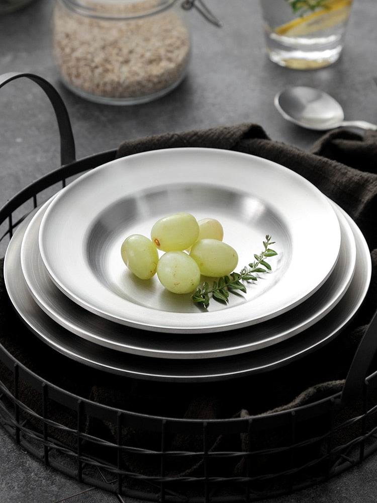 Diese Edelstahlplatten sind resistent, starr und brechen oder rosten nicht. Andere Eigenschaften sind, dass sie leicht zu reinigen und für den Geschirrspüler geeignet sind. Diese Teller sind elegant und verleihen Ihrem Tisch einen Hauch von Entspannung.